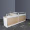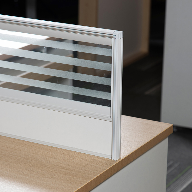 此款办公桌为板式实木颗粒板材质,上方配有半透明屏风,简洁美观;